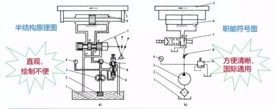 - 吸油:泵–节流阀–换向阀(左)–液压缸(左) 向右移动